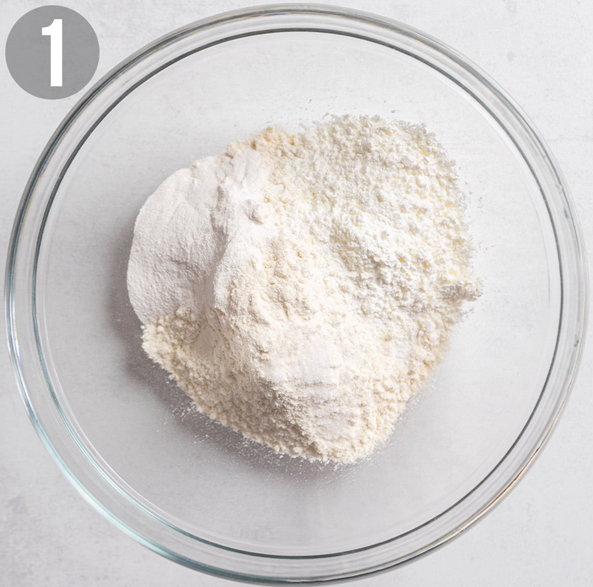 - Add all-purpose flour, cornstarch, baking powder, and salt into a bowl. Mix well with a spoon, and set aside.