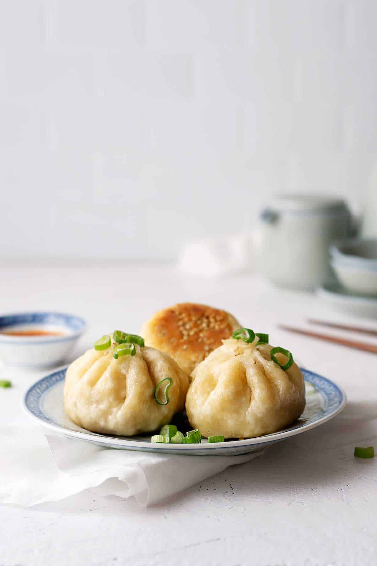 These buns are my adaptation to the Chinese pan-fried buns or baozi. The dough is typically made using yeast.