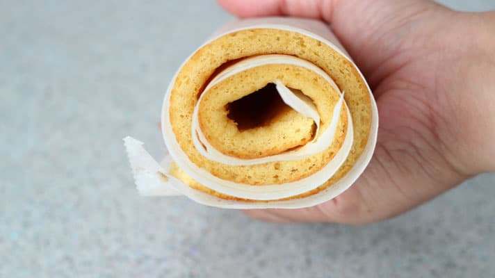 - Place 1 sheet of pionono (roll cake) on a working surface. Spoon the filling onto the pionono and spread evenly. Leave 1 inch empty space at the opposite end of where you will be starting to roll the pionono.